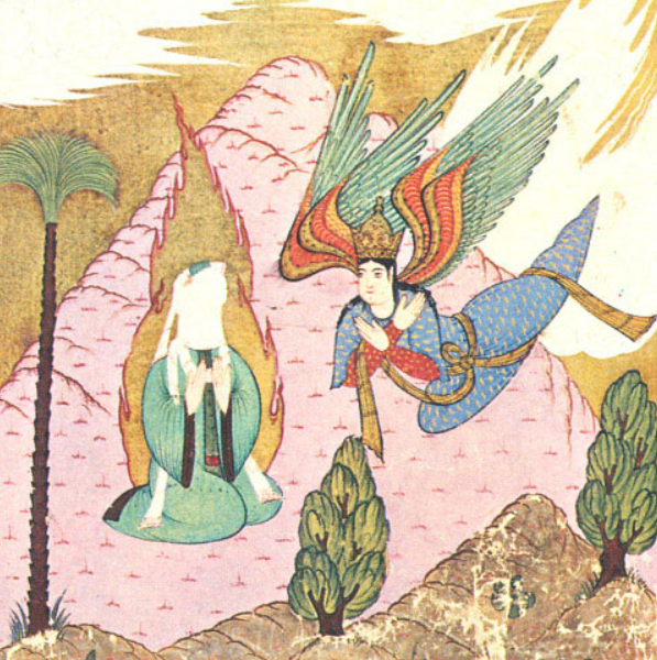 A 16th-century Siyer-i Nebi image of angel Gabriel visiting Muhammad [Wiki, Public Domain}