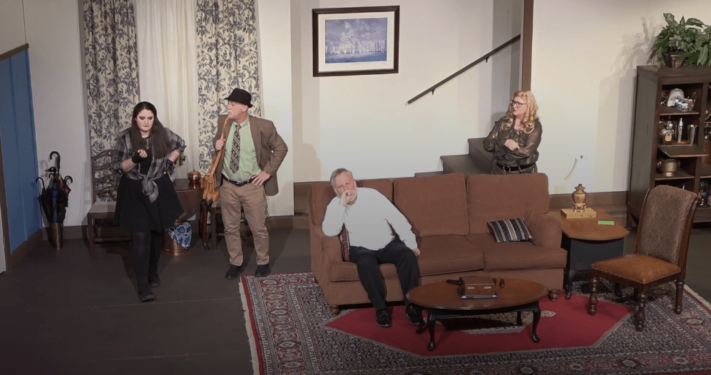 This past spring of 2025 I was in a (tragi-)comedy play at the Tater Patch Players in Jasper, Georgia, called What is ‘Murder?’ My role was as the detective, Val Clenard, trying to figure out which of three “Jeopardy” championship contestants had killed a fourth. It was a LOT of fun (and work), of course. I am trying to post the link, but it won’t cooperate. Well, here’s a still from the play, at least! That’s me as the sloppy detective, in the hat.